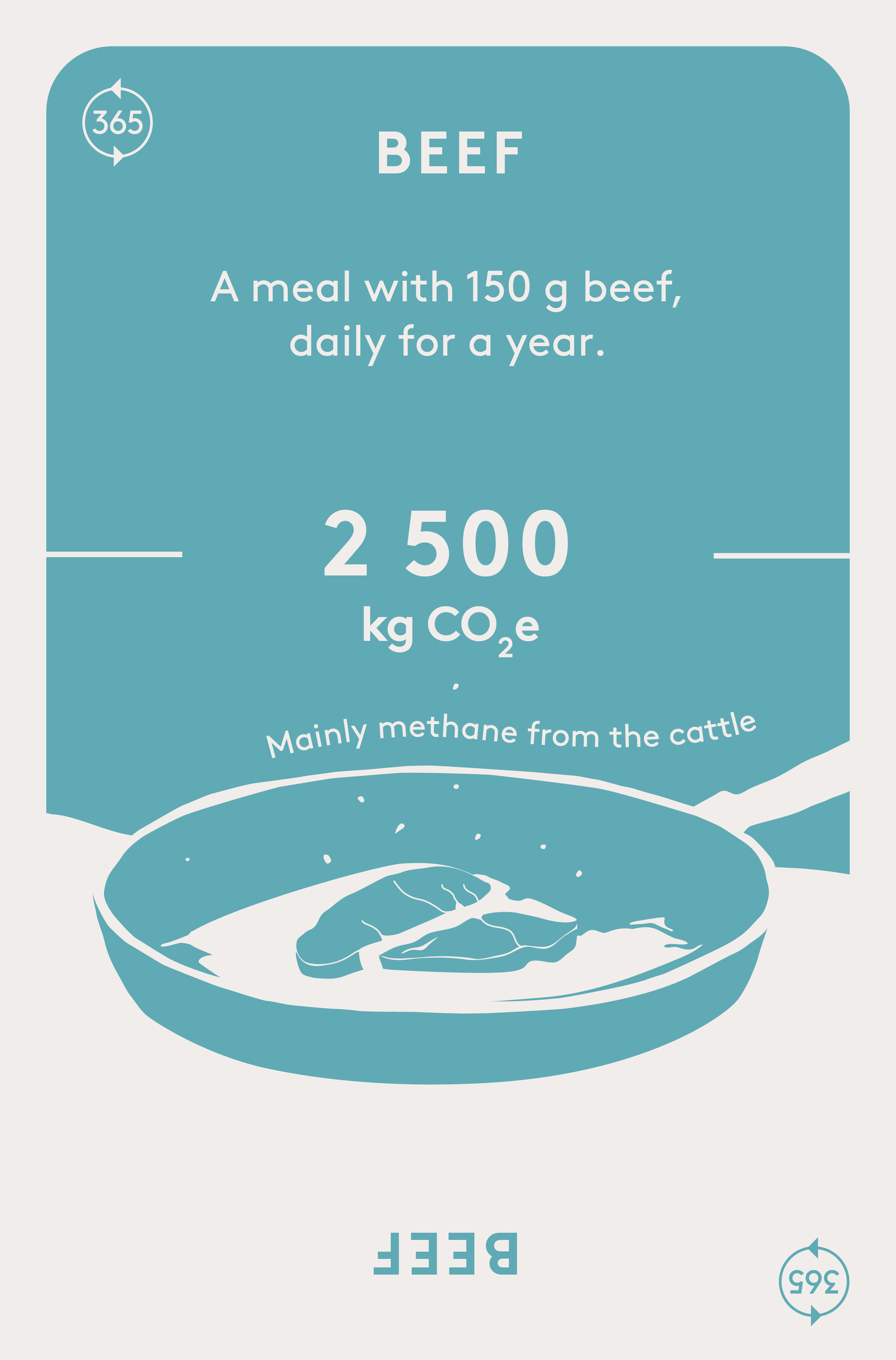 To calculate the greenhouse gas emissions from consuming a meal of beef and potatoes every day for a year, we multiplied the quantities of food that need to be produced by the emission factors for the respective foods. We assumed that a meal consists of 150 g of boneless beef and 300 g of peeled potatoes.